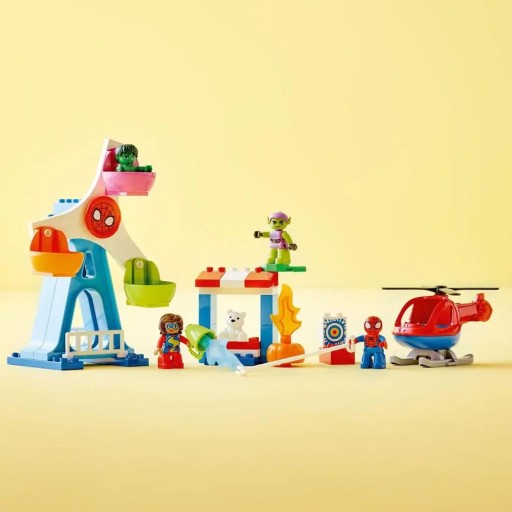 - Kultowe postacie — ten bogaty w atrakcje zestaw pozwala zbudować wesołe miasteczko i zawiera cztery figurki LEGO® DUPLO® postaci ze świata Marvela: Spider-Mana, Hulka, Pannę Marvel i Zielonego Goblina