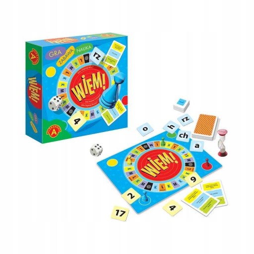 plansza, pionki - 4 szt., karty - 55 szt., tabliczki z literami - 35 szt., tabliczki z liczbami - 35 szt. , żetony - 40 szt. , klepsydra, katapulta, kulka, kubek, instrukcja.