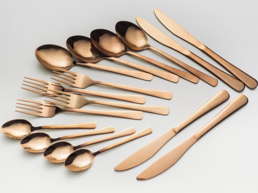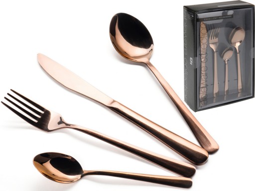 Proste i eleganckie sztućce, wykonane ze stali nierdzewnej w kolorze miedzianym. Możliwość mycia w zmywarce. Komplet przygotowany dla czterech osób. Pięknie prezentują się na stole.