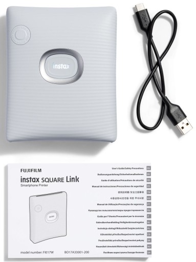 Zestaw zawiera: drukarkę FUJIFILM Instax Square Link w kolorze białym, kabel USB-A - USB-C oraz instrukcję obsługi.