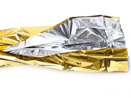 ✅ Koc wykonany jest z cienkiej metalizowanej folii poliestrowej z jednej strony w kolorze srebrnym a z drugiej strony w kolorze złotym.