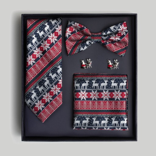 Ten zestaw zawiera muszkę i krawat. Dopasuj do swoich Świątecznych stylizacji odpowiedni dodatek. Na uroczystą kolację proponujemy muszkę, która w komplecie ze spinkami i poszetką będzie wyglądać elegancko. Do codziennych świątecznych stylizacji polecamy krawat. Model w zimowy wzór o klasycznej długości oraz szerokości. To must-have każdej świątecznej imprezy. Dzięki tym dodatkom każdy poczuje magię świąt.
