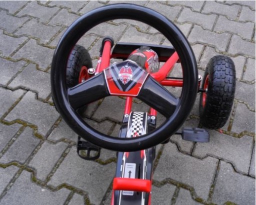 Sportowy, dziecięcy gokart napędzany na pedały posiada gumowe koła oraz ręczny hamulec. Pojazdem dziecko steruje samodzielnie siedząc za kierownicą i naciskając na pedały. Gokart pełni bardzo podobną funkcję jak rower czy też hulajnoga i pozwala dziecku aktywnie rozwijać kondycję ruchową - napędzany jest tylko siłą mięśni. Gokart przysporzy Maluchowi mnóstwo frajdy - można nim jeździć nie tylko do przodu, lecz również do tyłu.