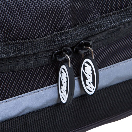 Za bezpieczne i mocne mocowanie odpowiadają dwie elastyczne gumy z haczykami, a liczne elementy odblaskowe poprawiają bezpieczeństwo motocyklisty po zmroku lub w warunkach złej widoczności.