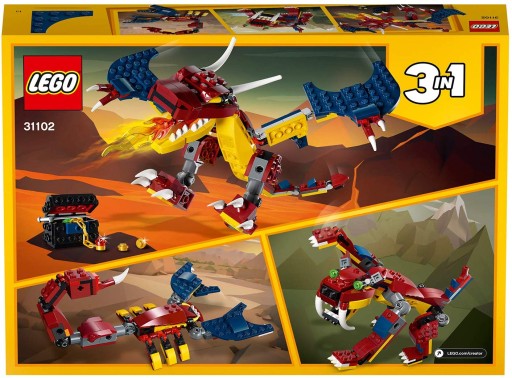 - Trzy opcje do zbudowania w jednym. Dzieci poprawią umiejętności konstrukcyjne podczas budowania smoka ognia Creator 3 w 1 (31102), tygrysa szablozębnego lub skorpiona. Modeli można używać osobno lub w połączeniu z innymi zestawami LEGO.