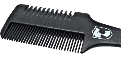 Ostatnim Przedmiotem wchodzącym w skład zestawu jest WZORNIK, SZABLON do regulacji linii zarostu. Uniwersalny, pasuje do każdej twarzy, intuicyjny w użyciu, łatwy do zachowania w czystości.