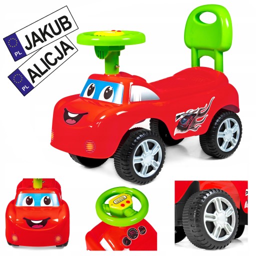 Do każdego jeździka dodajemy gratis dwie naklejki w formie tablic rejestracyjnych z podanym po zakupie imieniem dziecka.