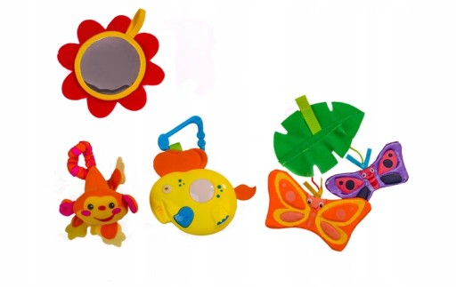 - 6 zabawek edukacyjnych (słonik z muzyczką i światełkami, motylki, małpka, żyrafka, lusterko))