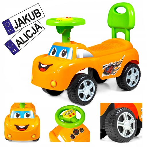 Do każdego jeździka dodajemy gratis dwie naklejki w formie tablic rejestracyjnych z podanym po zakupie imieniem dziecka.