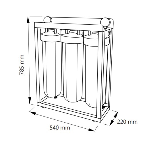 Profesjonalna konstrukcja znakomitego, europejskiego producenta filtrów wody, firmy Aquafilter Europe LTD. Zabudowany w stelażu trójstopniowy filtr oparty o kolumny standardu BIG BLUE 20, pozwala na dobieranie właściwych dla danych parametrów wody zestawów wkładów filtrujących i uzdatniających.