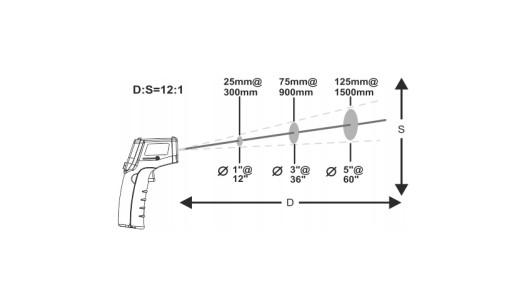 Wielkość punktu pomiaru zmienia się wraz z odległością w stosunku 12:1