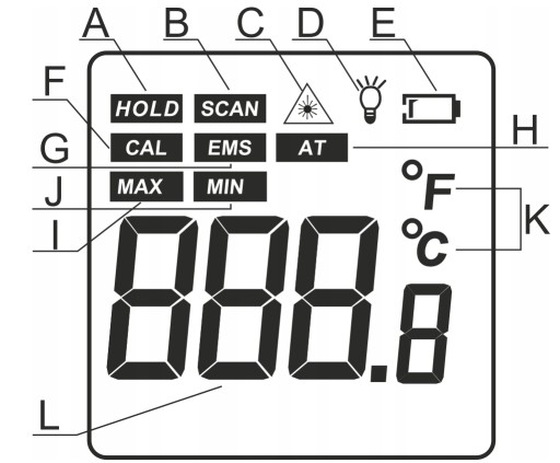 - EMS: emisyjność, która może zostać ustawiona w zakresie 0.10 and 1.00 przy użyciu przycisków,