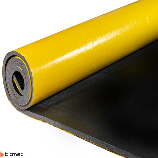 Pianka wyciszająca samoprzylepna z warstwą czarnej folii, która jest odporna na oleje, benzynę oraz wodę.