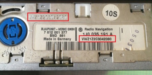 Numer seryjny radia rozpoczyna się od liter VWZ..., ciąg 14 znaków, znajduje się na obudowie radia, należy wyciągnąć radio i odczytać go z naklejki lub graweru na obudowie radia: