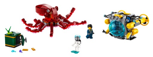 Ten zestaw LEGO Creator 3 w 1 pozwala dzieciom zbudować trzy różne modele do zabawy. Pociechy mogą zacząć od złożenia modeli batyskafu i ośmiornicy, a potem przebudować je w mniejszy batyskaf i wielkiego homara. Można również stworzyć scenkę z udziałem dużej płaszczki i nurka na rafie koralowej. Oczywiście nic nie stoi na przeszkodzie, aby zdać się na wyobraźnię i zbudować z klocków coś całkiem innego.