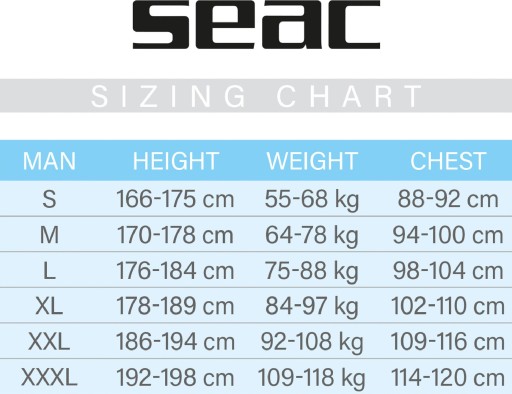 - DOSKONAŁE DOPASOWANIE – model Seac Fit występuje w wersji z długim rękawem (Seac Fit Long) i krótkim rękawem (Seac Fit Short) w 6 rozmiarach dla mężczyzn, od S do XXXL. Wszystkie aktualnie dostępne warianty można znaleźć wśród naszych ofert.