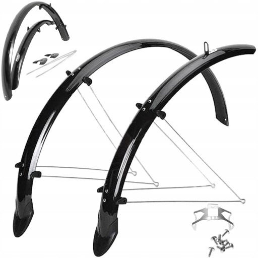 Komplet błotników rowerowych marki ORION. Przeznaczone zostały głównie do użytku w rowerach miejskich i trekkingowych. Długość tylnego błotnika to 69 cm, przedniego 55 cm, a ich szerokość wynosi 53 mm. Wykonane i dopasowane zostały do kół o rozmiarze 26”. Błotniki są nieocenionym elementem wyposażenia każdego roweru bezpośrednio wpływającym na komfort i bezpieczeństwo jazdy. Dla zwiększenia ochrony dodatkowo wyposażone zostały w chlapacze. Błotniki ORION posiadają system mocowania OR-TYPE, który charakteryzuje się bardzo łatwym montażem i wysoką odpornością na złamanie. W zestawie znajdują się uniwersalne wsporniki do montażu, które można dowolnie dopasować poprzez ich przycięcie na określoną długość oraz pasują do większości ram rowerowych wyposażonych w otwory przy piaście i na poprzeczce łączącej rury tylnego trójkąta.