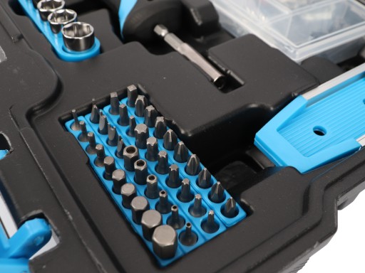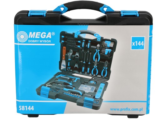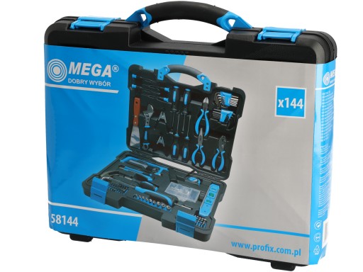 Komplet składa się z 144 elementów narzędzi takich jak: nasadki, klucze nastawne, wkrętaki, szczypce, piła ręczna, nożyk, młotek, poziomica i inne.