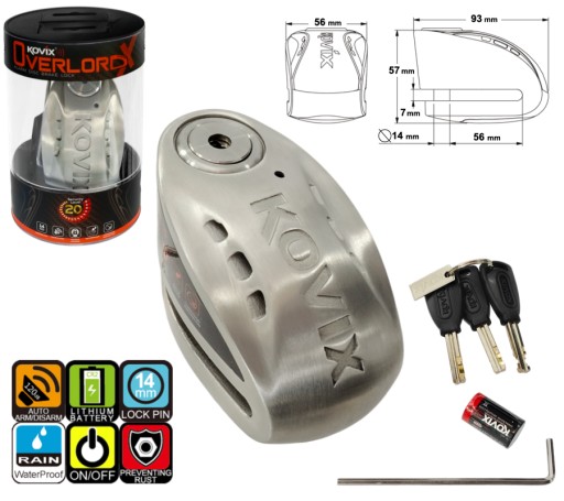 Blokada tarczy hamulcowej z wbudowanych alarmem o natężeniu dźwięku 120 dB z możliwością ustawiania opcji syreny ON/OFF. Zamek ze stali nierdzewnej i wodoodporne podzespoły elektryczne gwarantują ochronę przed korozją i niezawodność w każdych warunkach atmosferycznych. Blokada wyposażona jest w długo pracującą i przyjazną dla środowiska litową baterię. Zabezpieczenie blokuje koło bolcem o średnicy 14 mm, przez co uniemożliwia jazdę i ruch motocykla lub skutera.