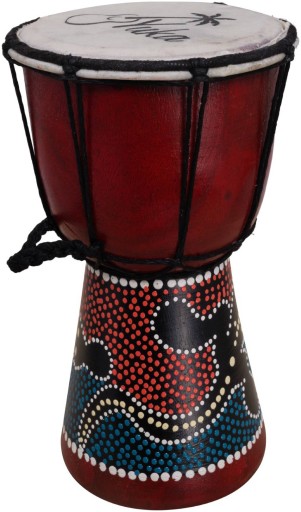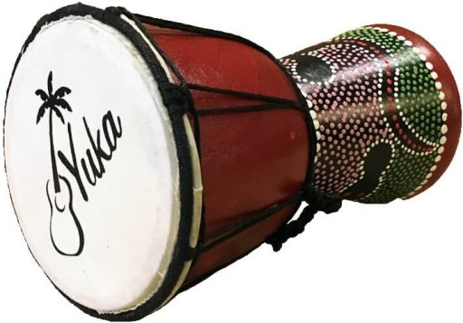 Djembe YUKA DJWK05-8 is made from a single piece of mahogany, and the drum head is made from goatskin. Sizes are approximate, since djembe is made from a single piece of wood, the size may vary, especially the diameter. This model measures 7.5" (19 cm) in miniature size (approximately) with a membrane diameter (approximate) of 5.5" (13.97 cm). The tension force of the membrane is adjusted using a nylon rope passed through metal rings. The body is decorated with ethnic dot painting. The drawing is applied by hand and is individual on each djembe.
