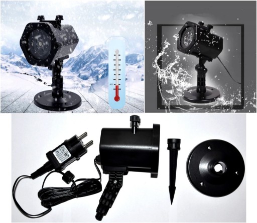 Bogaty pakiet dodatków : Nowy projektor ledowy Star shower , 12 wymiennych slajdów z obrazami o tematyce świątecznej , noworocznej i okolicznościowej , Przewód zasilający dł. kabla ok. 4,8m dedykowany zasilacz sieciowy 230V , podstawka , szpikulec , elementy montażowe , hermetyczne końcówki zasilacza