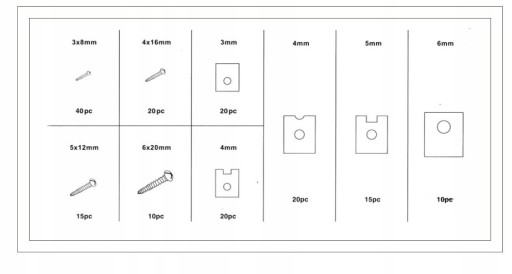 Zestaw wkrętów i podkładek do karoserii składający się z 170 elementów - wkrętów i podkładek do karoserii, o rozmiarach od M3x8 mm do M6x20 mm.