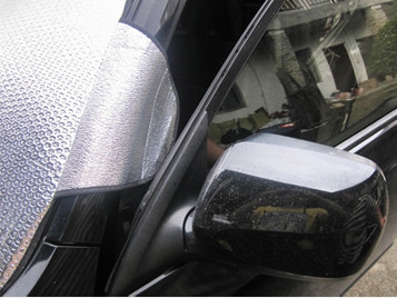 Montaż: Rozłożyć osłonę na przedniej szybie piankową warstwą do dołu. Przytrzasnąć boczne klapki drzwiami pojazdu.