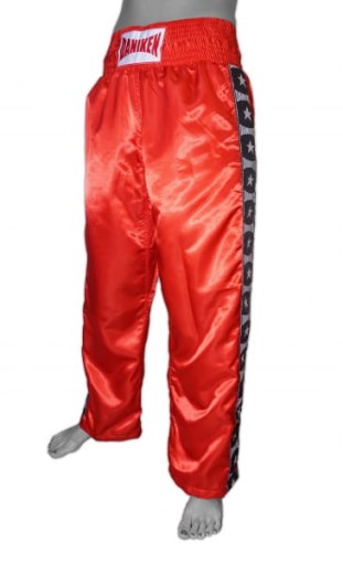 Spodnie KICKER zostały wykonane z satyny, 100% poliestru. Atrakcyjny i bardzo ozdobny model z taśmami żakardowymi po bokach. Ulubiony model dla pewnych siebie fighterów. W pasie guma o szerokości 8 cm i sznurek, dzięki którym maksymalnie dopasujesz rozmiar spodni do swoich wymiarów. MATERIAŁ: lekka satyna, 100% poliestru. PAS: szeroka guma ze sznurkiem pozwoli Ci maksymalnie dopasować rozmiar do swoich wymiarów.