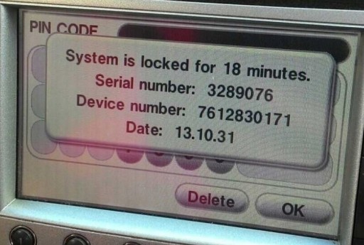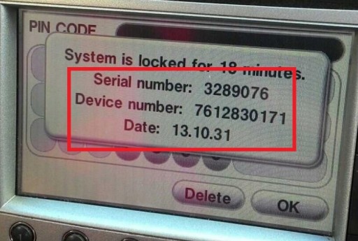 - Poprzez 3 krotne błędne wprowadzenie kodu do radia, przesłać zdjęcie danych na ekranie lub przepisać dane zaznaczone na zdjęciu na czerwono w ramce (potrzebne pełne 3 linijki danych), (Patrz zdjęcia poniżej)