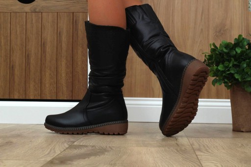 Kozaki damskie w kolorze czarnym z ozdobnym wykończeniem na cholewce.❄ Posiadają pełne ocieplenie w postaci futerka. Idealne na zimę. Stabilna, gruba podeszwa, dobrze amortyzuje stopę i chroni ją od zimna. Najnowsza kolekcja 2022!
