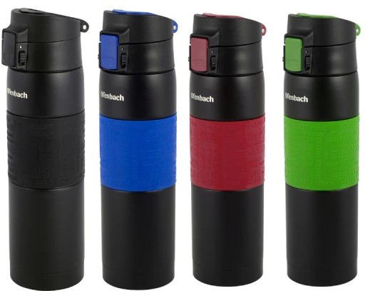 Posiada odkręcaną pokrywkę z wygodnym systemem otwierania za pomocą przycisku.Podwójne ścianki. Odporny na wstrząsy.