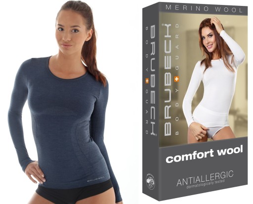 BRUBECK COMFORT WOOL TERMOAKTYWNA BIELIZNA DAMSKA - kolekcja Comfort Merino Wool polskiego producenta Brubeck powstała z niezwykłej dzianiny na bazie WEŁNY OWIEC MERYNOSÓW australijskich. Dzięki wyjątkowym parametrom idealnie nadaje się do użytku codziennego, jak i lekkich aktywności sportowych. Produkty z tej serii adresowane są do aktywnych kobiet, którzy oczekują od bielizny codziennej wyjątkowego komfortu. Marka Brubeck jako pionier i lider branży bielizny termoaktywnej przełamuje stereotyp według, którego KOSZULKI i GETRY WEŁNIANE, to produkty na zimę. Otóż kolekcja Comfort Merino Wool, to INTELIGENTNA BIELIZNA, która DOPASOWUJE SIĘ DO OTOCZENIA i panujących warunków i w razie potrzeby CHŁODZI lub OGRZEWA. To dlatego świetnie sprawdza się o każdej porze roku. Specjalny gatunek wełny merino reaguje na otaczające warunki i skręca się chroniąc w ten sposób przed zimnem lub rozkręca zapewniając pełną wentylację. Ponadto WEŁNA MERINO o długim włosie "nie czepia się" skóry, dlatego nie ma efektu "wełny gryzącej ciało"