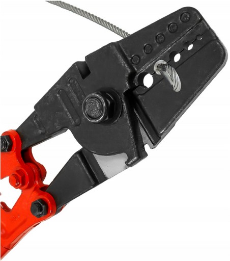 Specjalistyczne szczypce do zaciskania tulejek na linach stalowych. Głowica kuta ze stali , przystosowana do zaciskania tulejek w 5 średnicach ok 4 / 6,5 / 8 / 9 / 10 mm . Ramiona szczypiec / praski, wykonano z lakierowanych rur stalowych o długości ok. 660 mm- 24". Na końcówkach umieszczono wykonane z tworzywa, wygodne uchwyty. W głowicy znajdują się dwie szczeliny spełniające funkcję gilotyn do cięcia lin . Do silnego zaciskania tulejek blokujących linki stalowe. Umieścić zacisk liny w odpowiednim wycięciu szczęki szczypiec i silnie zacisnąć.