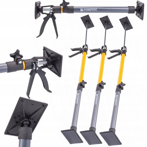 Podpora znajdzie swoje zastosowanie podczas montażu płyt sufitowych / ściennych (kartonowo-gipsowych) pod niewygodnym kątem lub przy naprawianiu powierzchni klejonych. Funkcja teleskopowa umożliwia regulację wysokości, a uchylne płyty dociskowe zapewniają stabilne zamocowanie.