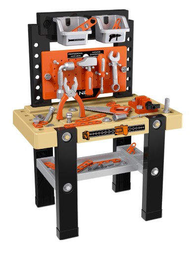 Mini warsztat dla dzieci NEO (nr. ref GD010) składa się ze stołu warsztatowego z tablicą z otworami, dwoma pojemnikami na narzędzia, imadła, klucza, piły, młotka, śrubokrętu, przedłużki, kombinerek oraz elementów do skręcania, śrubek, podkładek i nakrętek. W sumie ponad 64 elementy. Wymiary produktu po złożeniu: 27x50x68 cm. Produkt przeznaczony dla dzieci powyżej 3 roku życia.