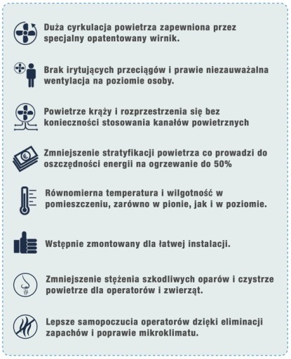 - Wyrównuje mikroklimat we wszystkich partiach w pomieszczeniu, w pionie i poziomie