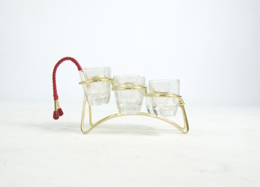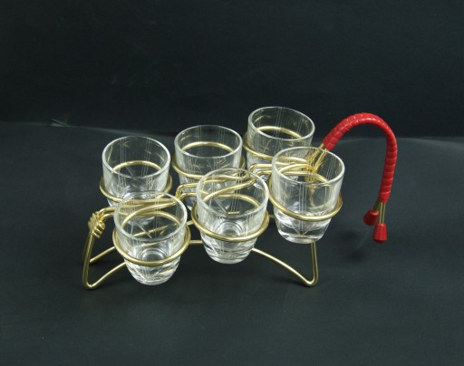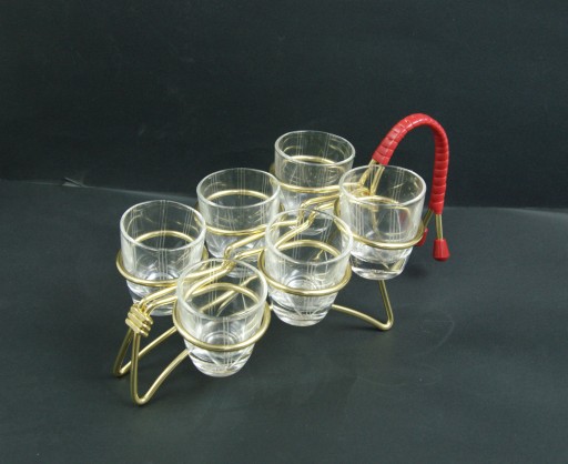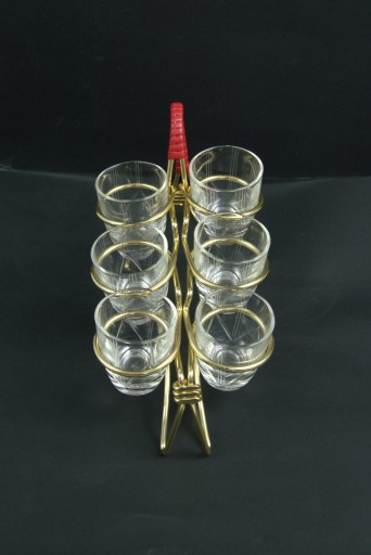 Komplet sześciu kieliszków na charaktyrystycznym dla lat 60 stojaku. Stan zachowania bardzo dobry, normalne ślady użytkowania.
