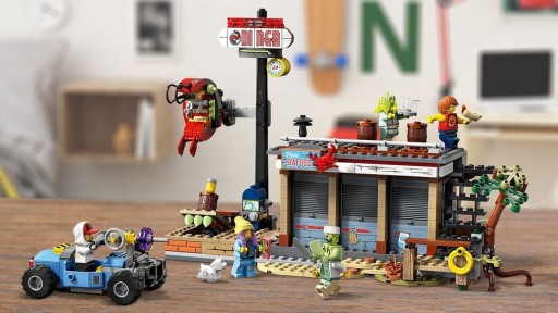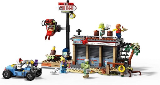 - W tym wyjątkowym zestawie znajdziesz odlotowe gokarty z miejscem na dwie minifigurki, pełną detali restauracyjną kuchnię oraz duży szyld z krewetką, który może się poruszać i zostać nawiedzony przez ducha.