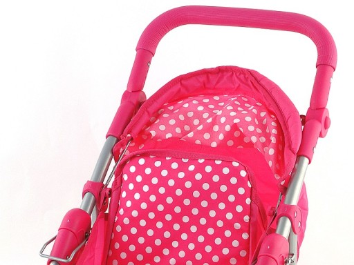 wózek spacerówka dla lalki, profilowana rączka, podwójne obrotowe kółka, z koszem; róż-kropki