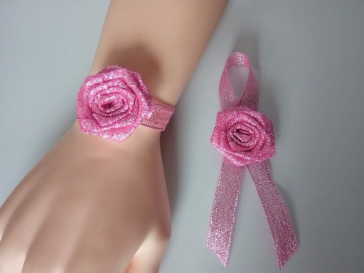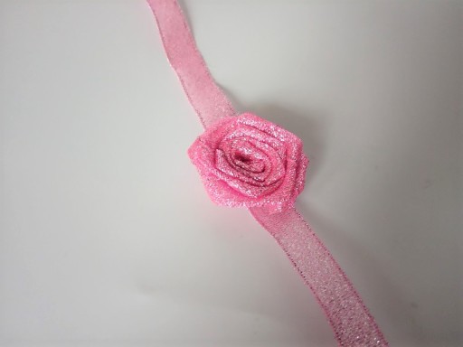 Ozdoba wykonana jest z satynowej brokatowej różyczki i wstążki.