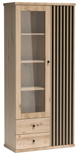Nowoczesna witryna z listwami na czarnym tle. Mebel idealny do jadalni czy salonu. Wyobraźcie sobie wnętrze z meblem, który tworzy klimat, coś czego jeszcze nie było, dekoracyjne lamele na ciemnej płycie z dodatkiem metalowych nóg i oświetlenia – wasze wnętrze stanie się atrakcyjne. Szklany front w witrynie to rozwiązanie do wyeksponowania naczyń czy świątecznej zastawy.