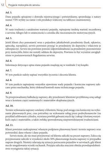 - zagadnienia dotyczącym przyjęcia motocykla do serwisu,