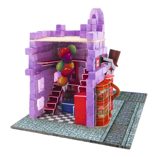 W sklepie braci bliźniaków, Freda i George'a, klienci mogli zaopatrzyć się w psikusy i magiczne gadżety. Użyj tekturowych elementów dekoracyjnych, dodaj czerwony mech, aby nadać ulicy Pokątnej niepowtarzalny klimat. Po skończeniu budowy, możesz odzyskać materiały budowlane ( cegły ), wrzucając konstrukcję do pojemnika z wodą. Odzyskane materiały możesz przeznaczyć do własnej, przez siebie wymyślonej budowli.