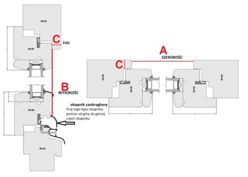 - Grubość felca (przylgi) z uszczelką włącznie np. grubość felca C = 16 mm