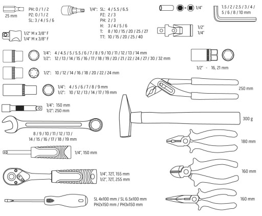 Zestaw zawiera także klucze płasko-oczkowe, wkrętaki płaskie i krzyżakowe, szczypce długie płaskie oraz do cięcia, szczypce uniwersalne oraz nastawne oraz młotek. Bity w zestawie to m.in. PH0, PH1, PH2, PZ0, PZ1, PZ2, płaskie 3, 4, 5, 6 mm. Wkrętaki płaskie i krzyżakowe mają różne rozmiary, co ułatwia dostęp do trudno dostępnych miejsc.