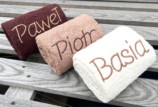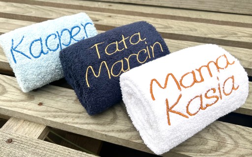 - komplet ręczników łazienkowych z Twoim haftem imion lub napisów 2 wyrazowych, np.;Mama/Babcia + imię, Tata/Dziadek + imię,