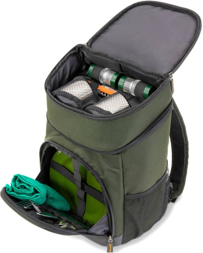 Anaconda Catering Hopper to nowoczesny plecak z dodatkową komorą chłodzącą. Wbudowana termoizolacyjna wyściółka przez długi czas utrzymuje chłód. Dzięki dołączonym do zestawu naczyniom i sztućcom wyprawa na ryby stanie się relaksującym piknikiem.