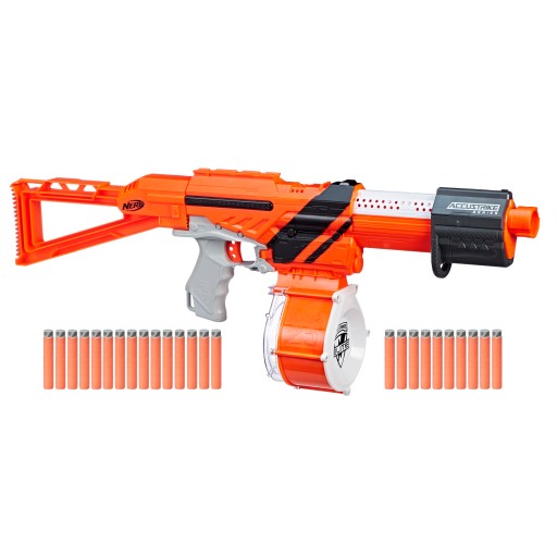 Accutrooper jest częścią serii AccuStrike, która zawiera strzałki zaprojektowane z myślą o większej celności. Jest to wyrzutnia o zasięgu około 20 metrów. Wyrzutnia wyposażona jest w magazynek bębenkowy na 25 strzałek, który dzięki swojej pojemności daje dużą przewagę nad przeciwnikiem. Zamocuj magazynek i przesuń uchwyt do przeładowywania do tyłu i do przodu, aby zładować wyrzutnię, a następnie pociągnij za spust, aby wystrzelić. Chcesz zaskoczyć przeciwnika i szybko wystrzelić cały magazynek? Accutrooper posiada funkcję ciągłego ognia. Przytrzymaj spust i przesuwaj uchwyt do przeładowywania do tyłu i do przodu, aby wystrzelić strzałki za pomocą błyskawicznej akcji. Ponadto wyrzutnia posiada doczepianą kolbę, która zapewnia dodatkową stabilność podczas celowana, jedną szynę taktyczą oraz dwa punkty mocowania paska.