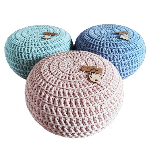 Woreczki z granulatem styropianowym dopełniające pufy dziergane z dnem sznurowanym lub na zamek.