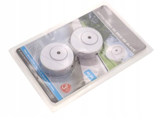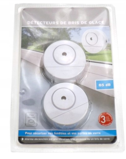 Alarm pęknięcia szyby wytwarza głośną syrenę o wartości 85 dB, gdy szkło wibruje, pęka lub pęka. Ten alarm jest zasilany bateryjnie (baterie w zestawie). Alarm pęknięcia szyby można łatwo przymocować za pomocą taśmy dwustronnej. Zawiera przycisk włączania / wyłączania.